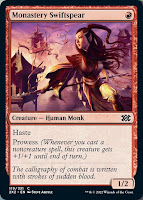 Pauper legality is related to power creep, but has an additional nuance: changing a card's rarity to common means that a card can be included in the pauper format. In this forthcoming set, 26 cards are now printed at the common level what were previously printed as uncommons (or, in a few cases, rares). Pauper players are all over Monastery Swiftspear in particular, a card that will undoubtedly become a staple in that format: